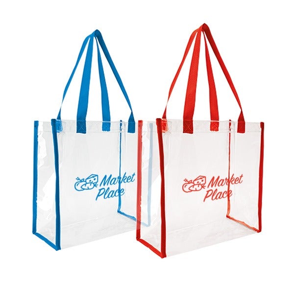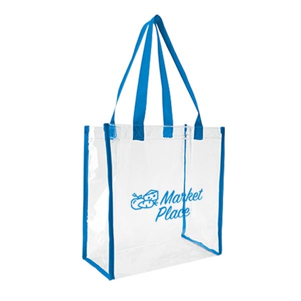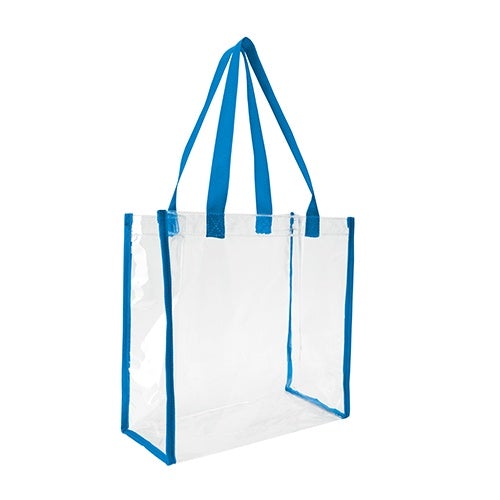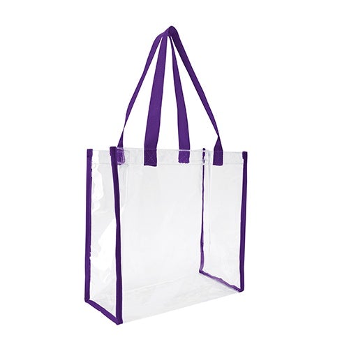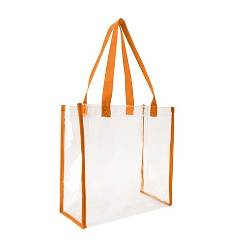 Breeze through security checks with this clear game tote! This clear vinyl tote bag allows your stuff to be seen through it, and complies with NFL regulations. Its color handle and trim adds a touch of fun to this clear tote. Add just the right sized imprint of your logo or brand and this bag is ready to go! Perfect for sporting and outdoor events.