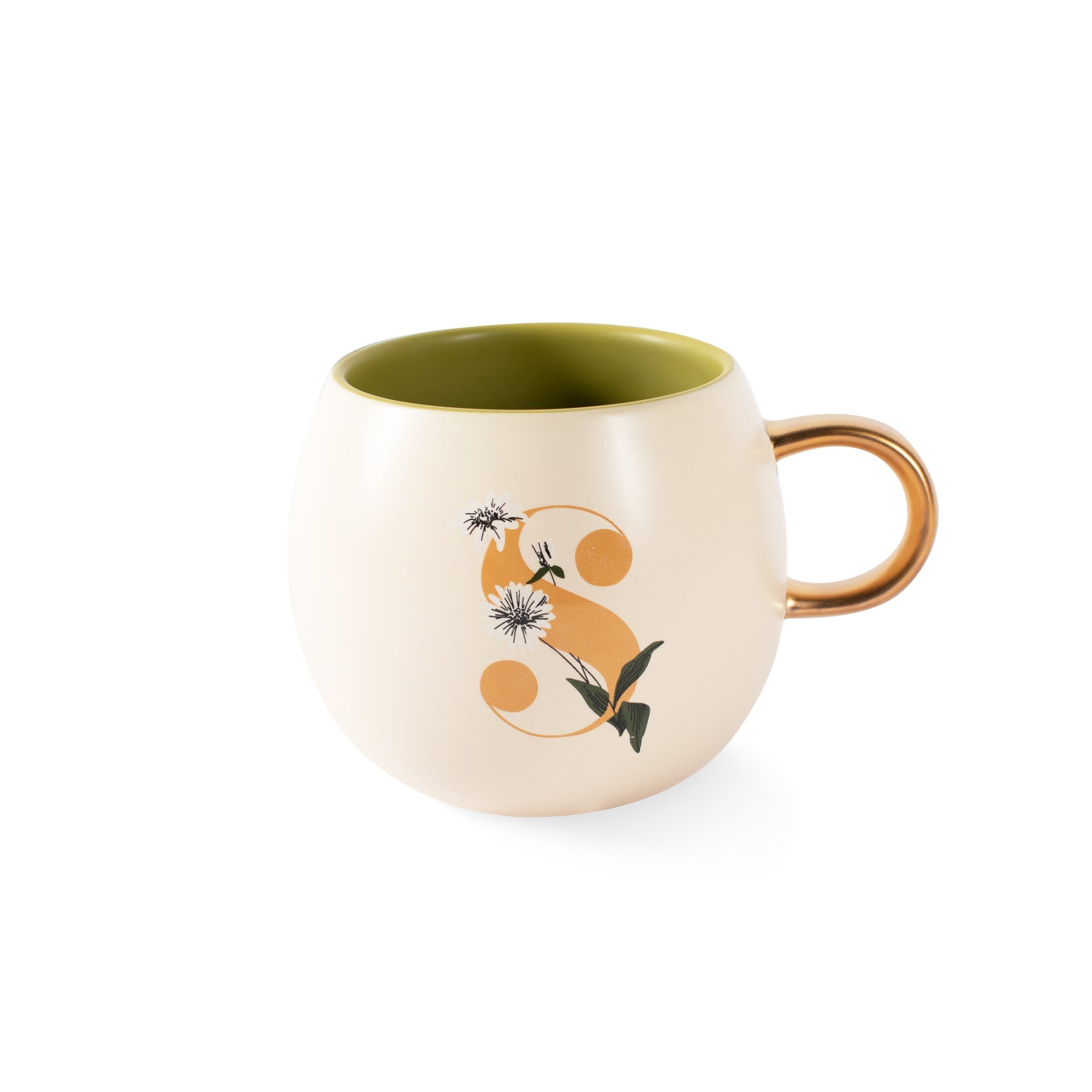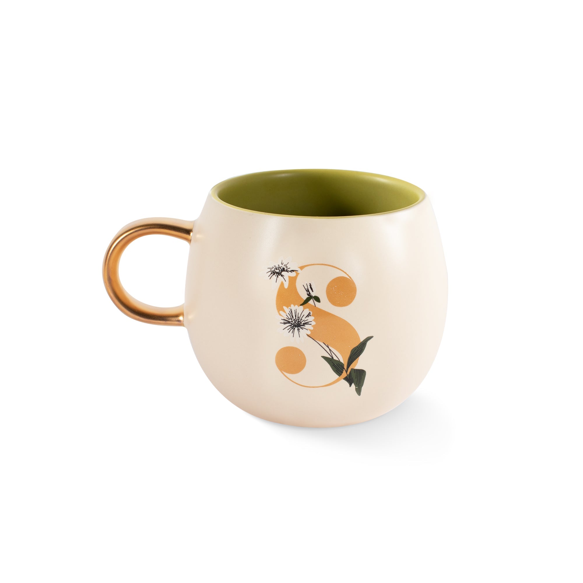 Ceramic mug featuring artwork by Dylan Mierzwinski with matte cream exterior glaze, matte olive green interior glaze, decal art, and hand-painted gold handle.