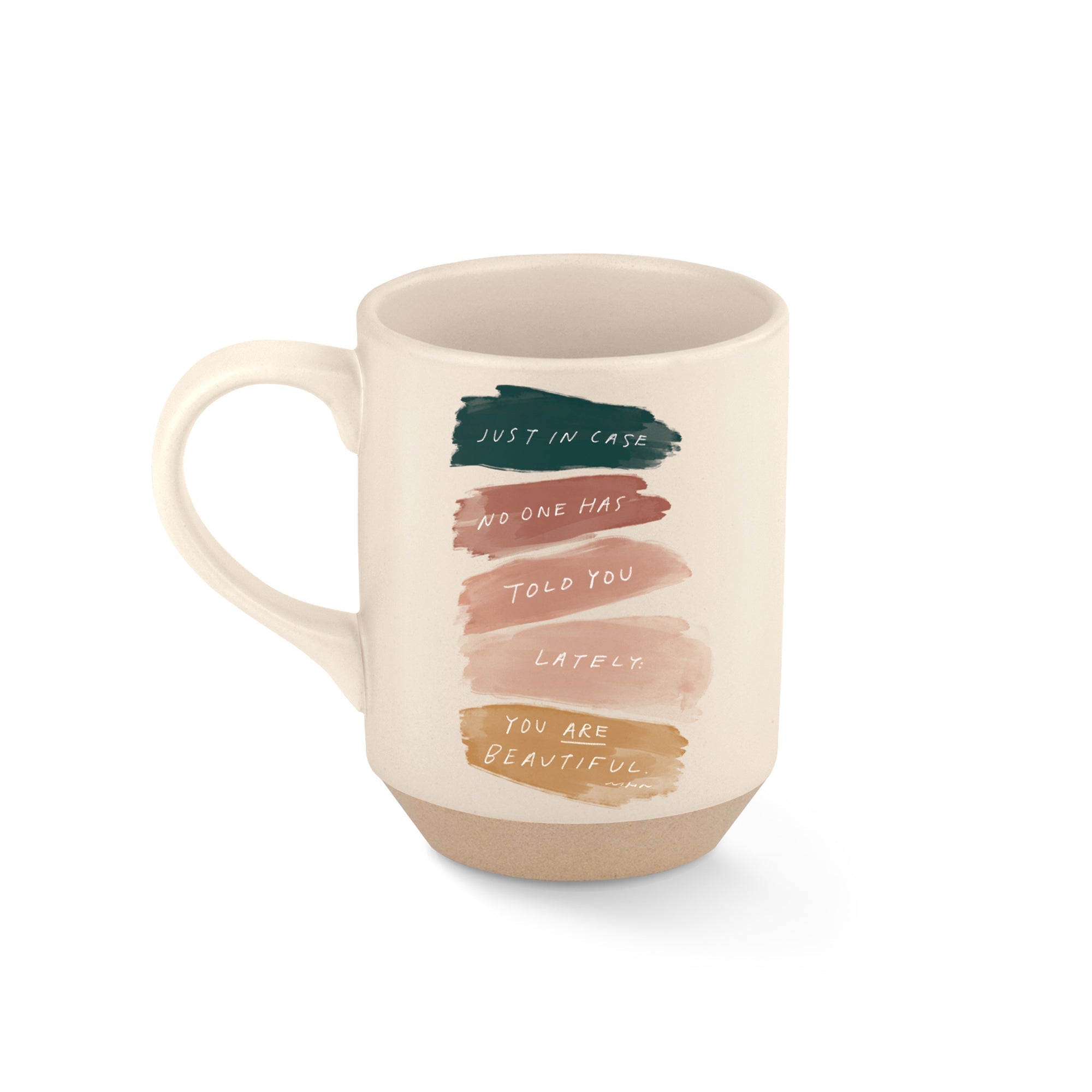 Ceramic mug featuring exclusive artwork by Morgan Harper Nichols with matte cream glaze, decal art, and exposed stoneware base. Inspirational message on mug: “Just in case no one has told you lately: You are beautiful.” – MHN