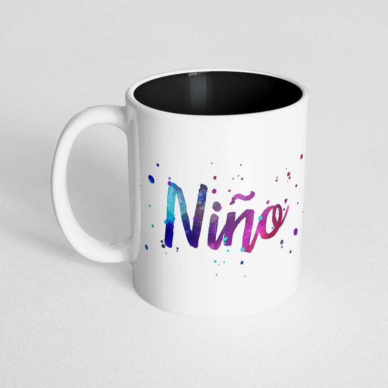 Your name in a font of your choice with a “galaxy” watercolor design on a black innercolor mug.